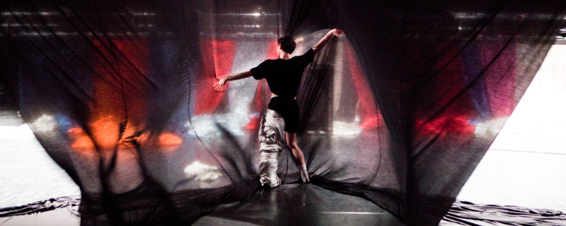 La peinture baroque m’a inspirée. Ces grands drapés qui tombent du ciel, s’enroulent autour de corps nus, les étranglent presque, j’y ai vu l’image de notre condition : pris dans une vie émaillée de relations et de contradictions multiples, dans un monde qui globalement déraille. Dans la pièce, nous sommes comme à l’intérieur d’une tête géante où les pans de soie matérialisent cette agitation mentale permanente. Il faut sans cesse ramasser, plier, dégager l’espace, être aux prises avec ce qui nous tombe sur la tête et arrive d’on ne sait où, et poursuivre. Le tissu seul ne fait rien, le défi a été de le maintenir constamment en l’air, d’y insuffler du mouvement. La pièce est techniquement et physiquement éprouvante. L’équipe connaît à présent chaque centimètre de ces rouleaux, leurs trous, leurs usures.