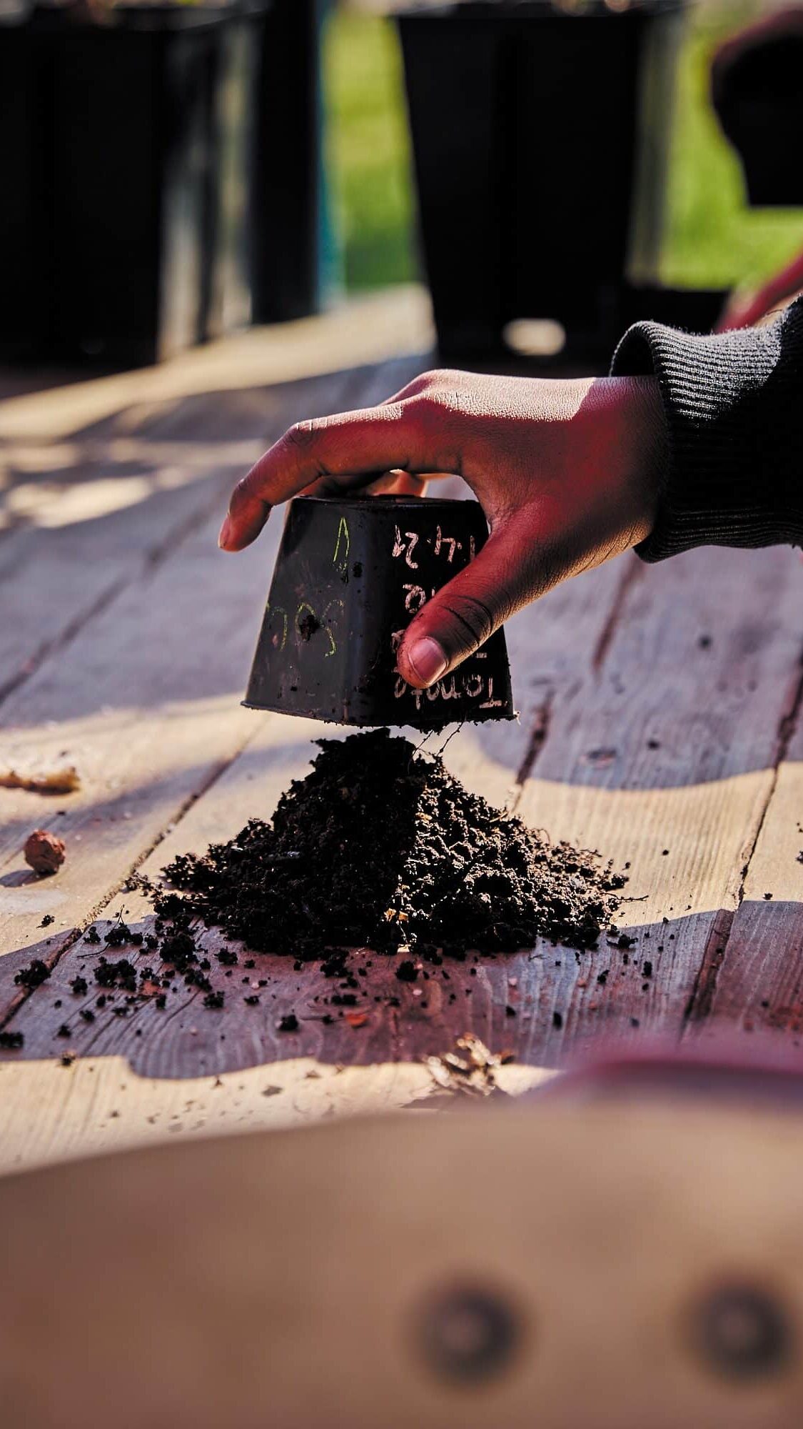 Le groupe se retrouve à présent sous l’un des auvents du jardin, devant les bacs à compost, que l’intervenante ouvre l’un après l’autre, en faisant observer la texture et la couleur de chacun d’eux, différentes selon le stade de décomposition des matières organiques. Sur une grande table, elle dispose des contenants ronds et peu profonds, où les élèves vont observer les insectes et vers prélevés dans les bacs. « Vous ne trouvez pas que c’est magique, le principe du compost ? » demande Aurélie Aliamus avant de présenter les quatre éléments que l’on retrouve toujours dans la terre, en proportions différentes : le compost, le sable, l’argile et le terreau. C’est ce mélange, cette « recette », que vont réaliser maintenant les élèves. Il faut d’abord trier le compost pour en retirer les déchets puis fabriquer des petites billes d’argile. « Vous allez avoir les mains douces », fait remarquer l’intervenante. Ces billes prennent place au fond des pots qui ont été distribués. Ensuite, on y ajoute un mélange de terreau et de compost, auquel on incorpore du sable, qui doit disparaître dans l’ensemble. « Jessica, c’est super, on dirait que tu fais un crumble ! ». Les élèves choisissent ensuite la graine qu’ils vont y planter : fève ou petit pois, d’aspects très différents. Au collège, il faudra arroser tous les deux jours puis les mettre en terre quand elles auront poussé. La séance s’achève sur un rituel, la dégustation d’une tisane de verveine et géranium rosa… fraîchement cueillis dans les Jardins passagers.