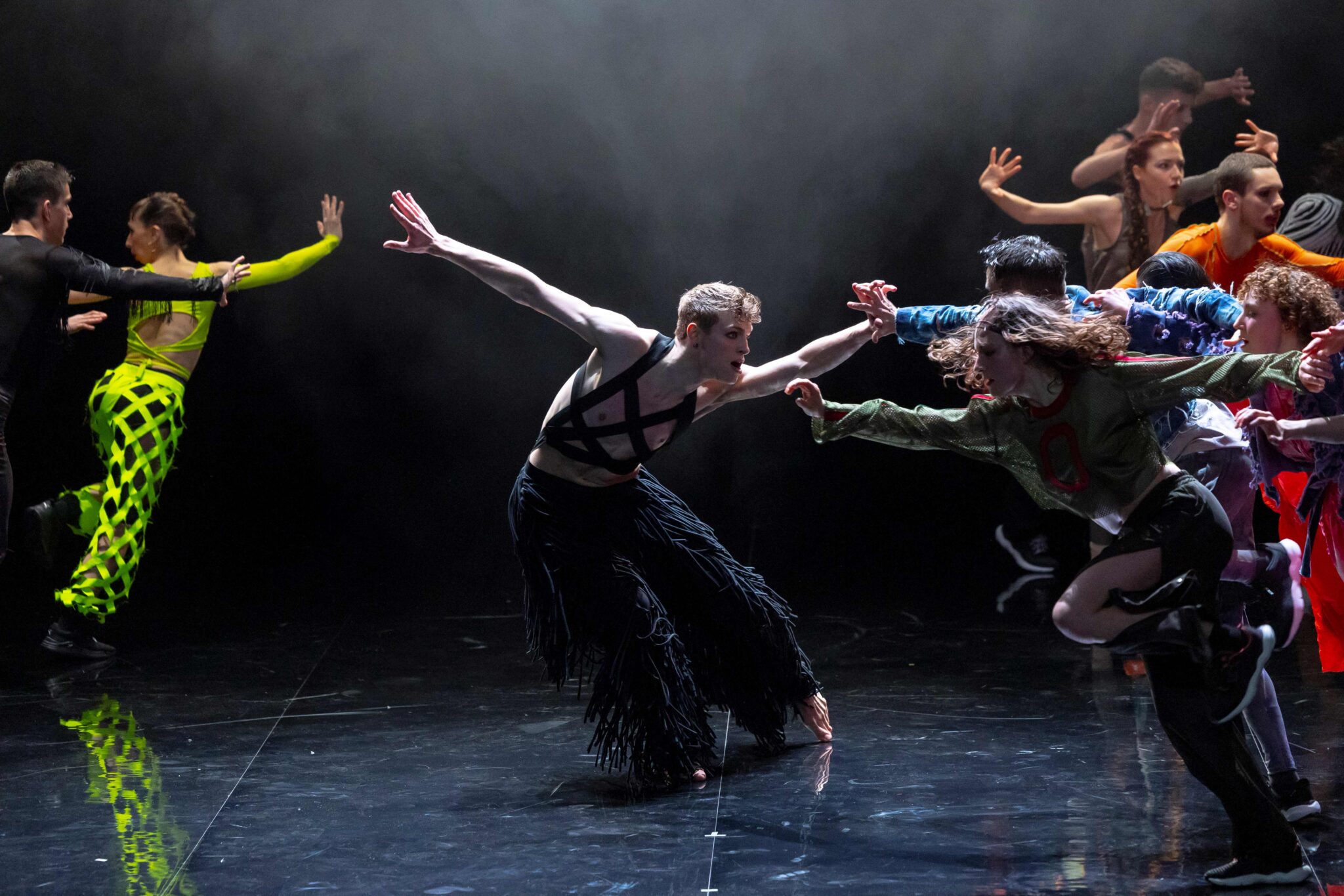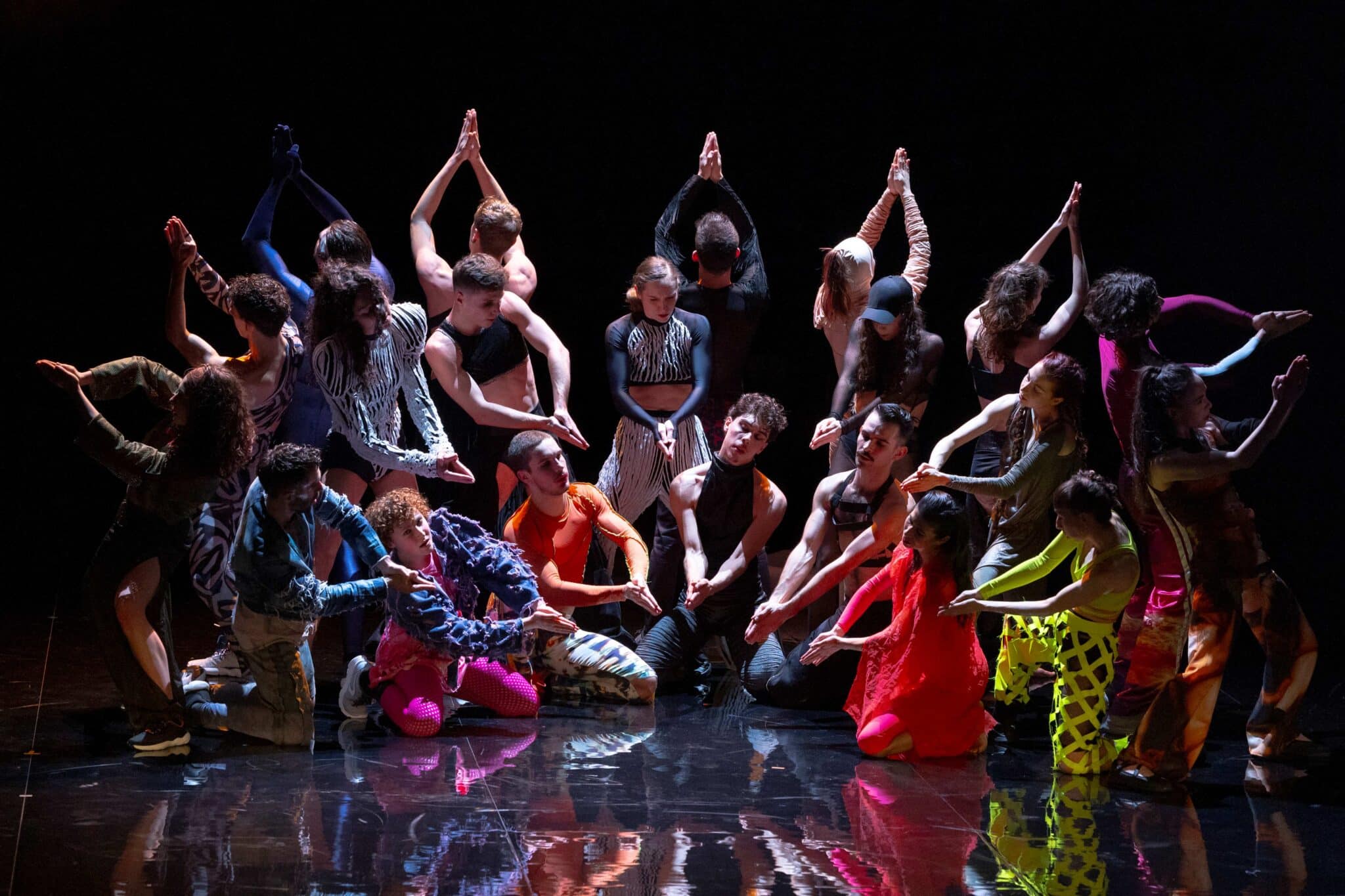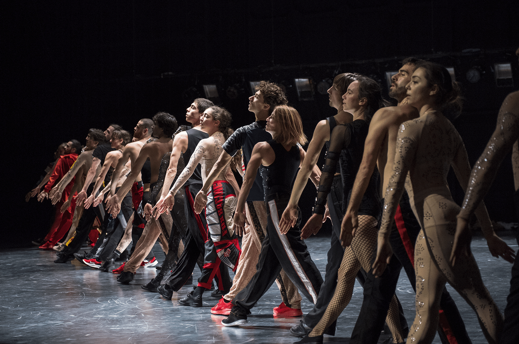C’est une forme de transe collective qu’explore le chorégraphe portugais Marco da Silva Ferreira en s’inspirant de la folia, danse folklorique d’origine rurale, qui offrait aux bergers du XVIe siècle une échappatoire aux conventions sociales. Elle est à l’origine d’un thème qui a traversé l’histoire de la musique, sur lequel le compositeur baroque Arcangelo Corelli a imaginé une variation, ici revisitée avec des synthétiseurs. Une mise en miroir de la fête traditionnelle portugaise et des danses de notre époque.