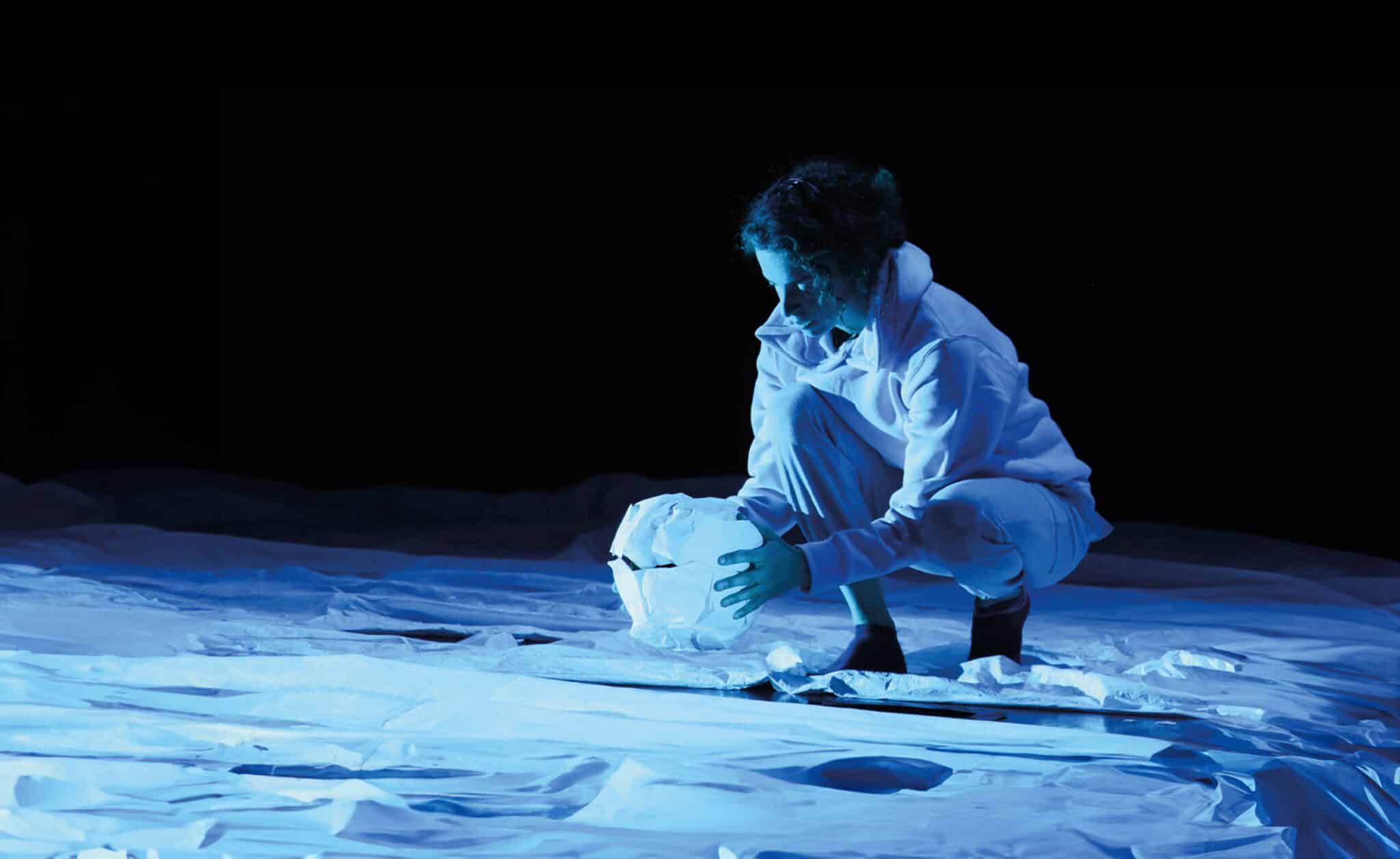 Au plateau, une multitude de boules de papiers froissés évoquent des brouillons jetés là, abandonnés. Sommes-nous dans l’atelier d’un artiste en quête d’inspiration, dans la chambre d’un adolescent en révision du bac, ou dans celle d’un enfant ? Ici, l’espace joue avec notre perception, les corps et les surfaces, en perpétuelle mutation, se répondent dans un jeu de cache-cache. Qu’est-ce qu’un brouillon sinon une étape invisible et oubliée, une tentative d’esquisse ? Le brouillon est l’espace de jeu où le monde et ses occupants peuvent se tromper, changer de route et se réinventer. Du papier nait le masque qui transforme le visage, crée le personnage et invente de nouvelles identités. Le dessin y est vivant, les formes et les teintes muent, disparaissent, ou se révèlent selon les couleurs projetées sur lui. Sous la surface est une invitation à considérer la tentative comme un outil créatif, pour se dépasser et acquérir confiance en soi.