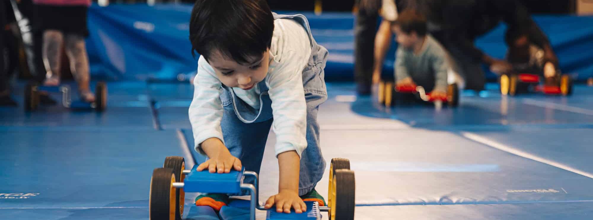 Les tout-petits découvrent leur corps en expérimentant des mouvements et des sensations avec les conseils d’un circassien et s’amusent avec les autres.