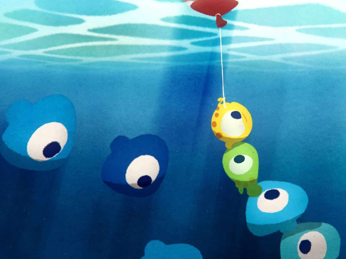 Des poissons se réunissent à la rescousse d’un poisson rouge qui flotte à la surface. Ils décident de faire tout ce qu’ils peuvent pour l’aider à respirer ignorant qu’il est en fait un ballon !