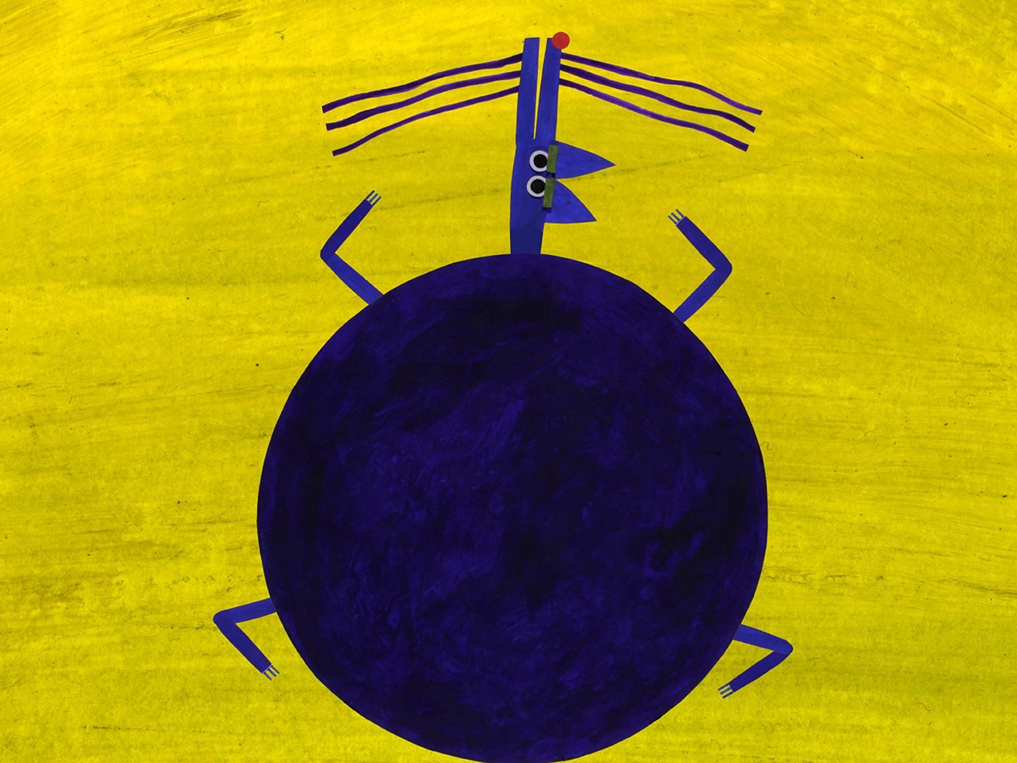 Une boule se balance au-dessus d’une structure creuse où vivent des bonshommes bleus et verts. Tous ensemble, ils compensent le poids de la boule. L’équilibre installé, ils dorment tranquillement.