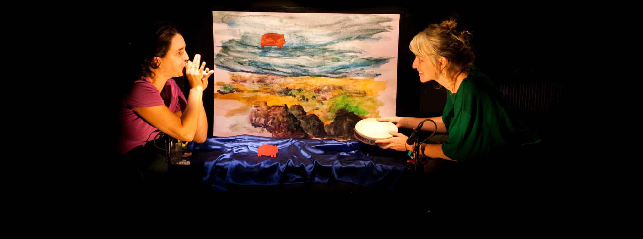 Ici tout se raconte du point de vue de l’enfant, avec délicatesse, comme un souvenir qui remonterait de loin. Lentement, Fuega la phacochère traverse les paysages, tantôt une odeur, un son ou une couleur l’attirent, et la voici qui poursuit sa route. Il n’y a pas d’humains dans ce monde-là, seulement Fuega qui affronte les éléments au gré de ses découvertes gourmandes. Tour à tour sous forme dessinée ou marionnettique, la phacochère a le don d’ubiquité, elle navigue du chaud au froid et du feu à l’eau. Les sons nous englobent, les odeurs nous réveillent, l’histoire se déploie par bribes, parfois avec hésitation, mais toujours du côté du rêve. Inspiré de l’art du kamishibaï japonais, le spectacle de Sophie Laloy se raconte à la frontière entre peinture, cinéma et théâtre d’objets. Grâce à un dispositif ingénieux, les scènes peintes s’animent ; notre perception se transforme, et le fantastique opère. À cela s’ajoute la musique qui vient texturer l’espace du conte, les sons naturels se confondant alors avec les instruments.