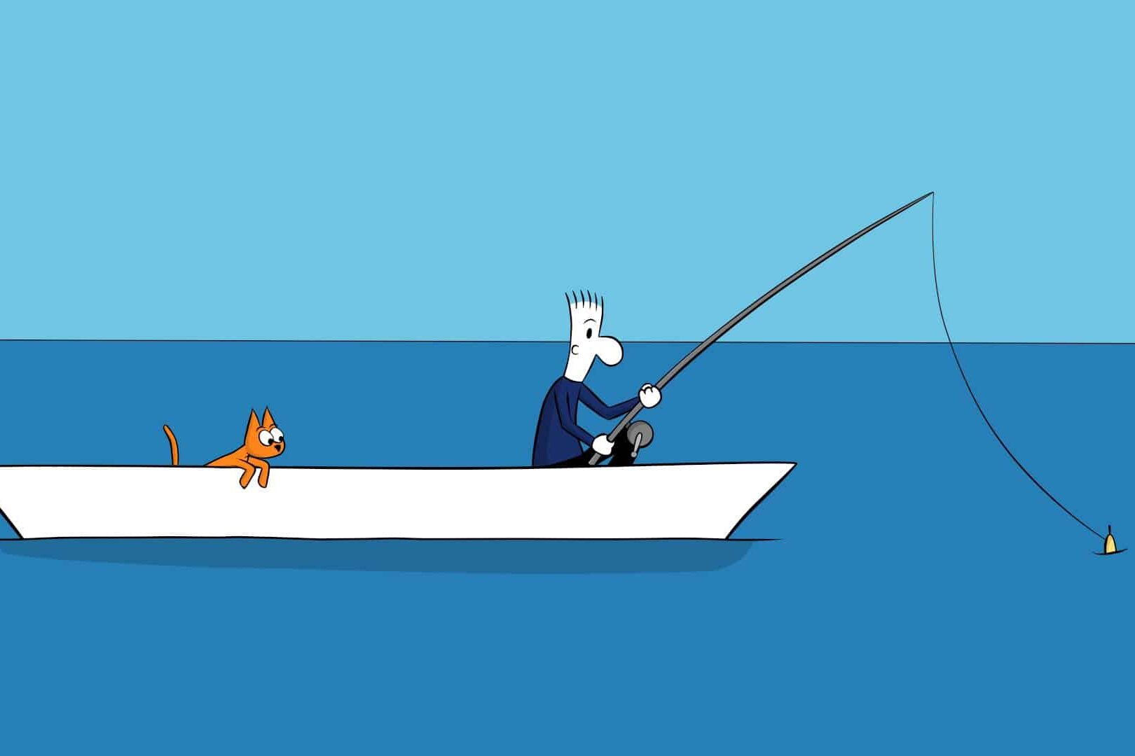 Sur une mer calme, un homme est dans sa barque, avec son chat. Il pêche tranquillement. Il attrape un premier poisson. Très vite, les touches et les prises vont se succéder, de plus en plus farfelues.