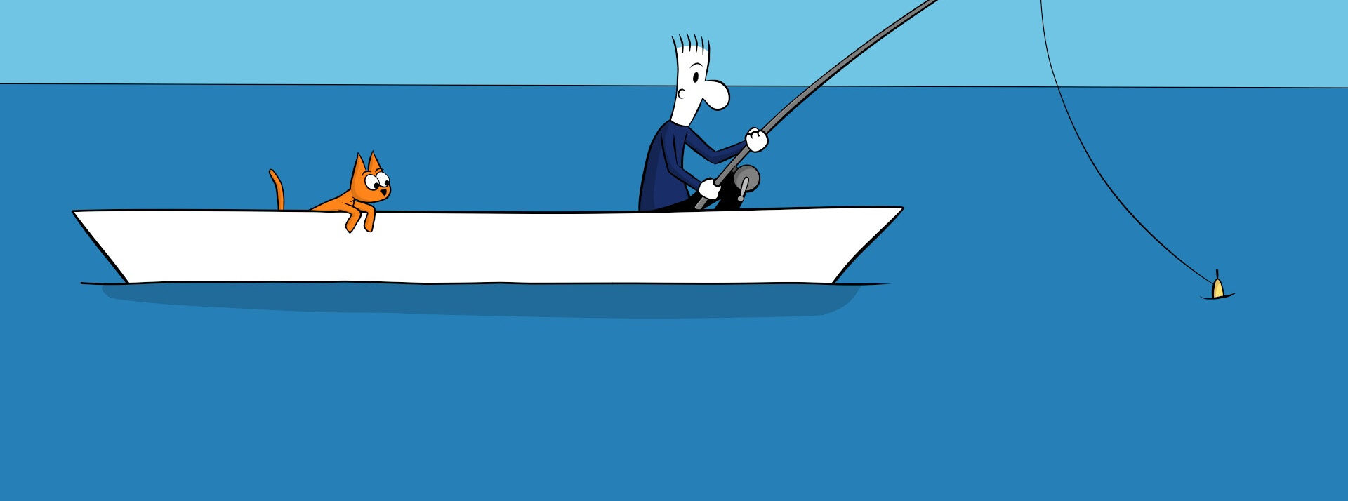 Sur une mer calme, un homme est dans sa barque, avec son chat. Il pêche tranquillement. Il attrape un premier poisson. Très vite, les touches et les prises vont se succéder, de plus en plus farfelues.