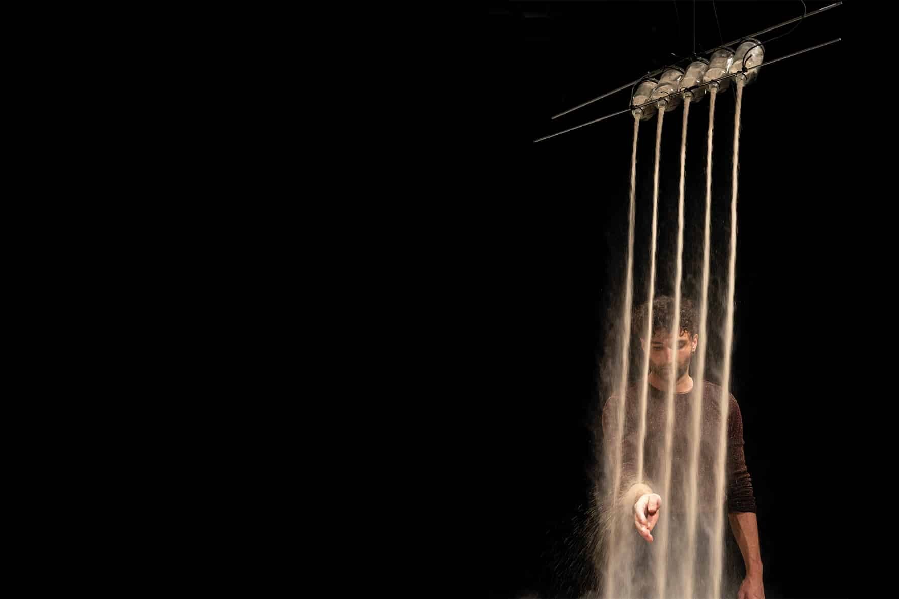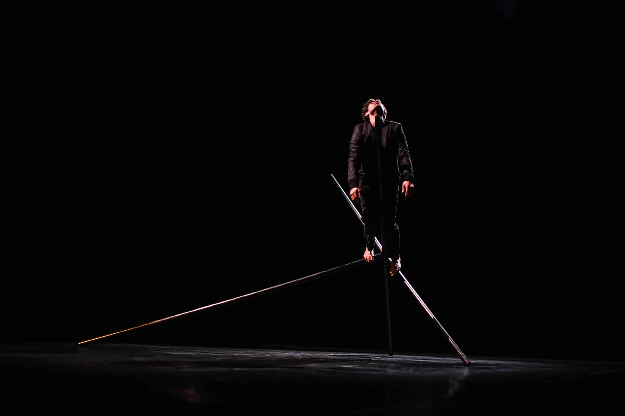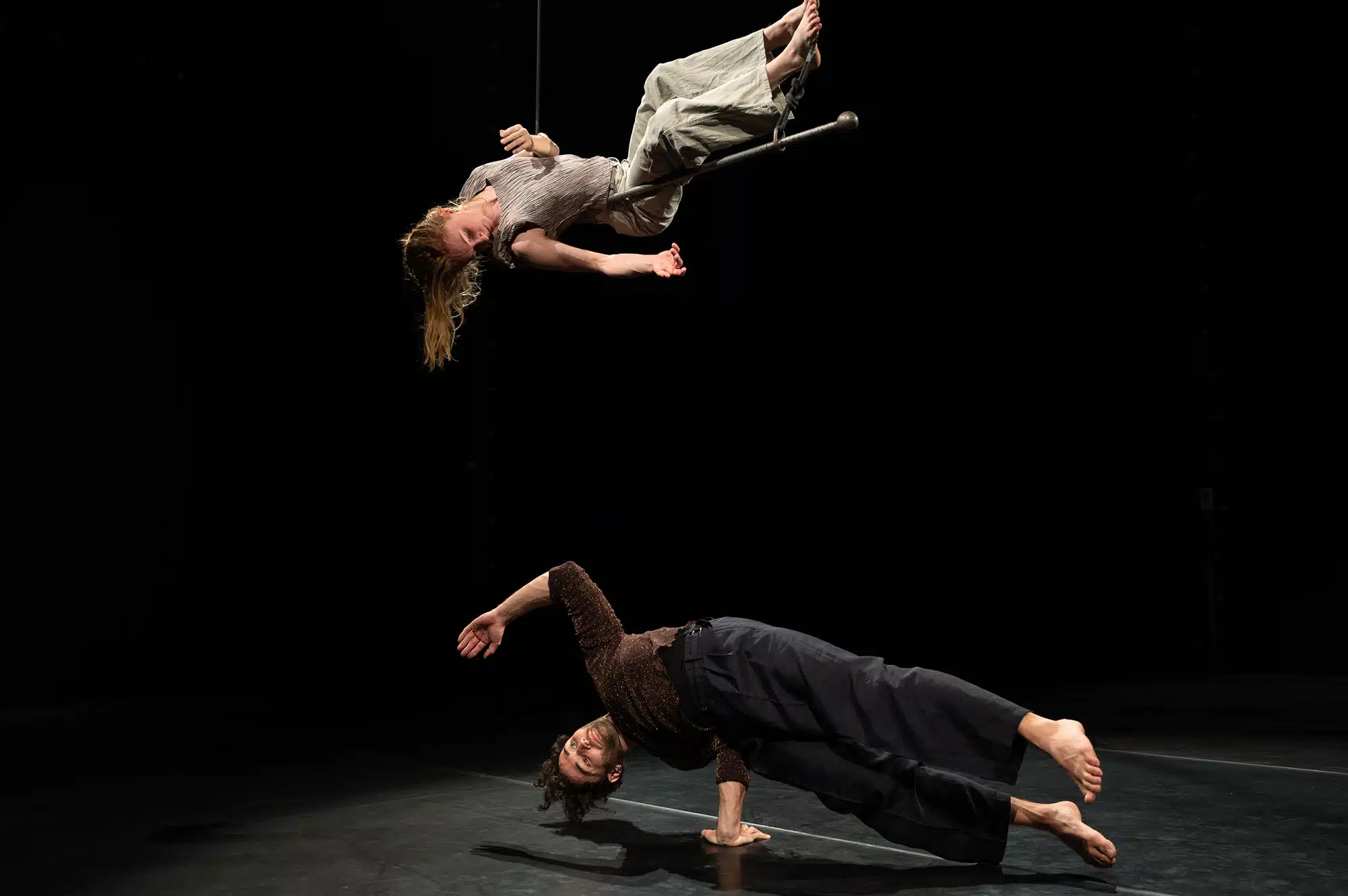 Dans une pièce où coexistent cirque, danse et arts plastiques, Quentin Folcher et Kamma Rosenbeck interrogent notre rapport au temps. L’une évolue en l’air, en suspension, quand l’autre est sur la terre ferme, en équilibre sur les mains. Le paradoxe est là : ces jumeaux n’auront pas la même expérience du temps et ne vieilliront pas à la même vitesse. Mouvements ralentis, accélérés ou suspendus, arrêts nets ou progressifs rendent palpable cette distorsion.