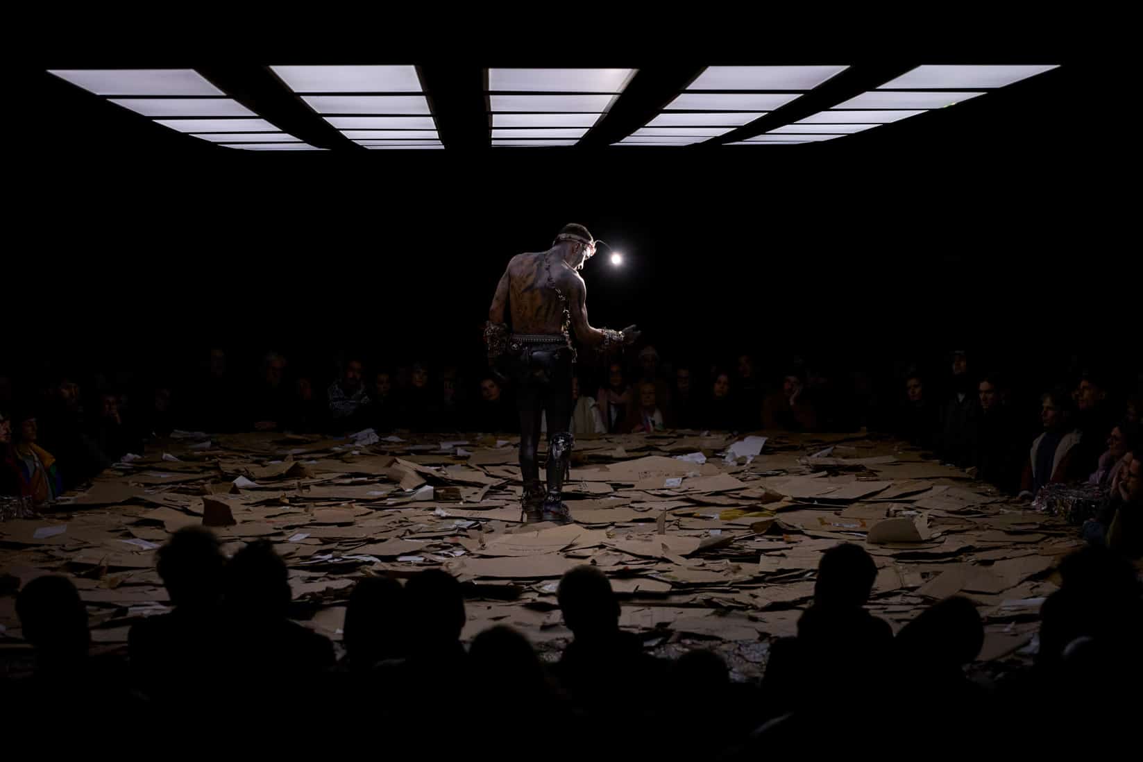 C’est une étonnante structure autour de laquelle le public prend place : un ring constitué de déchets, amas de cartons compressés où une vie semble possible. Sur ce terreau, le plasticien et metteur en scène Théo Mercier écrit le scénario d’une histoire d’amour à trois têtes, qui s’incarne bientôt sous nos yeux : deux personnages masculins vêtus d’une seconde peau en latex émergent progressivement de la surface, ils froissent le sol sous leurs pieds, se découvrent, se désirent, se dévorent et s’enfoncent dans un terrier de papier. Le trio interroge le désir et sa perte dans un jardin d’Éden inversé où la « fin du monde » devient la possibilité d’un nouveau début, d’une nouvelle humanité à construire. La production même du spectacle s’inscrit dans cet élan : la scène est recréée de toutes pièces dans chaque ville, en collaboration avec des déchetteries locales. Théo Mercier poursuit ainsi sa réflexion sur l’emprunt de matière comme façon de régénérer nos modèles et de réinventer notre relation à ce qui reste.