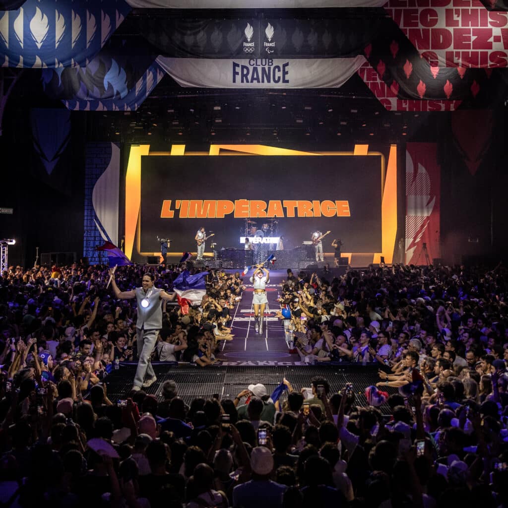 Ça y est, nous avons atteint la Grande Halle ! Teddy Riner, qui a gagné une nouvelle médaille d’or la veille, célèbre sur scène avec ses coéquipiers sous les applaudissements. Et juste après, L’Impératrice entrera sur scène pour nous faire un concert exceptionnel. Autant dire que la soirée n’est pas prête de s’arrêter.